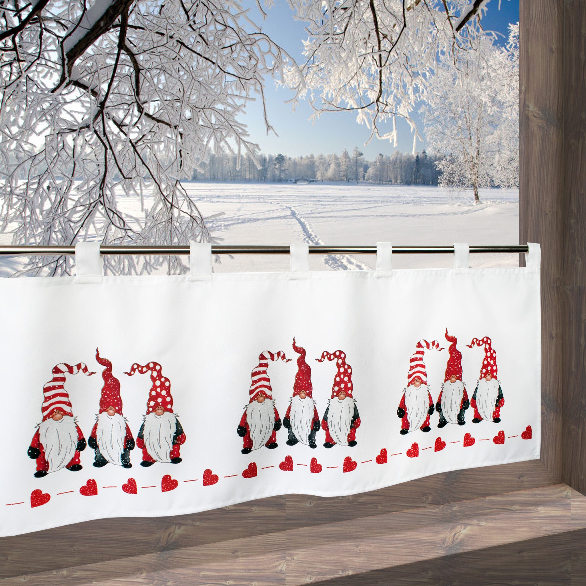 Fischer Fensterbilder- Scheibengardine mit Digitaldruck “Wichtel in Dänischen Stil“ für die Küche und Wohnzimmer/ Bistrogardine / Größe 45x120 cm